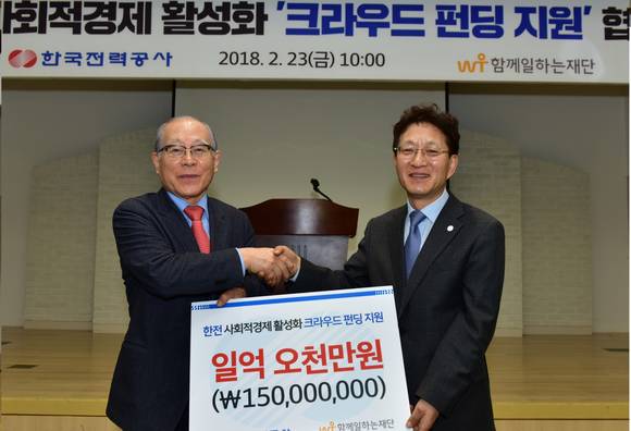 [프라임경제] 한국전력(사장직무대행 김시호·이하 한전)은 23일 한전아트센터에서 함께일하는재단과 20개 사회적경제조직 대표 등이 참석한 가운데 사회적경제조직 크라우드 펀딩 지원 협약식을 열고, 함께일하는재단에 후원금 1억5000만원을 전달했다.