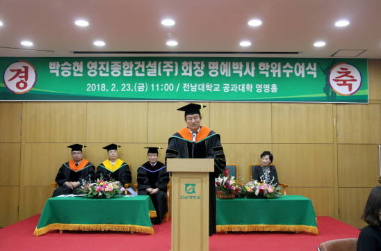 이에 박 회장은 "부족한 제가 이처럼 영예로운 학위를 받게 돼 영광"이라며 "앞으로도 모교인 전남대학교와 지역사회, 그리고 우리나라 건설산업 발전에 공헌할 수 있도록 최선의 노력을 다하겠다"고 응대다.