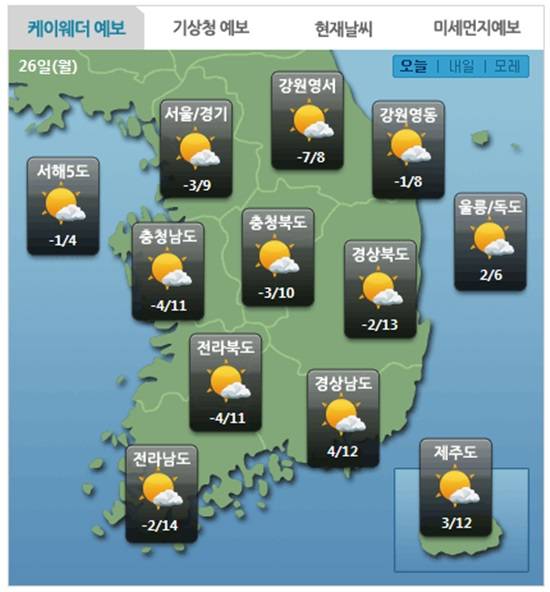 [프라임경제] 월요일인 26일(오늘) 전국이 맑은 가운데 일교차가 크게 벌어지겠다.