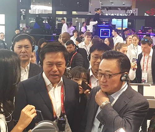 MWC 첫날인 26일(현지시각) 고동진 삼성전자 무선사업(IM)부문장(사장)과 함께 삼성전자 전시 부스에 들어선 박정호 SK텔레콤 사장은 "한국에 돌아가면 바로 갤럭시S9으로 바꾸겠다"고 말했다.