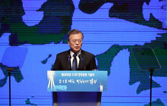 문재인 대통령이 28일 오전 대구 콘서트하우스에서 열린 '2·28 민주운동 기념식'에서 5·18민주화운동과 2·28민주운동의 연대와 교류를 언급해 관심을 끌었다.
