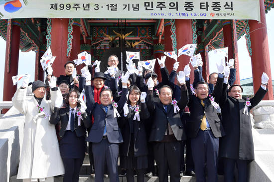 [프라임경제] 윤장현 광주광역시장(앞줄 왼쪽 세번째)이 1일 오전 동구 국립아시아문화전당 앞 민주종각에서 열린 '제99주년 3·1절 기념 민주의 종 타종식'에 참석해 이은방 시의회의장, 장휘국 시교육감, 독립유공자 유족, 시민 등과 함께 타종에 앞서 만세삼창을 하고 있다.