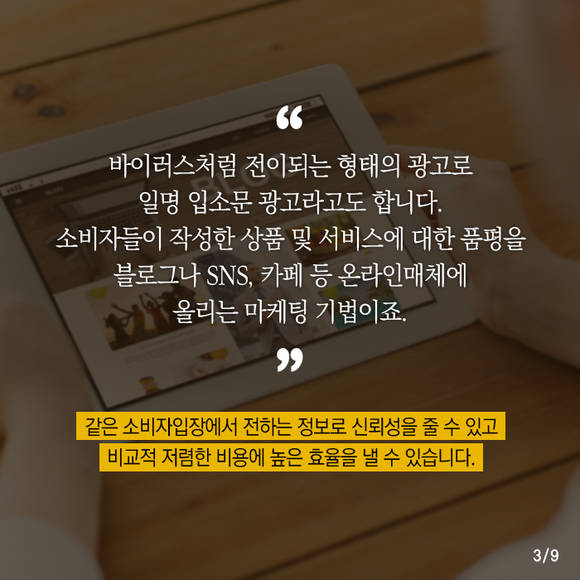 흔히 소비자들이 작성한 상품 및 서비스에 대한 품평을 블로그나 SNS, 카페 등 온라인매체에 올리는 마케팅 기법을 뜻하는데, 이를 통해 같은 소비자입장에서 전하는 정보로 신뢰성을 줄 수 있고 비교적 저렴한 비용에 높은 효율을 낼 수 있다다는 게 장점이죠.