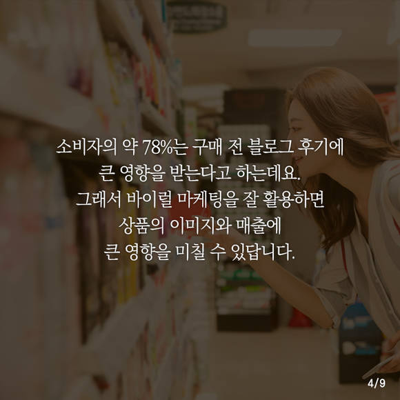 실제 소비자의 약 78%는 구매 전 블로그 후기에 큰 영향을 받는다고 하는데요. 그래서 바이럴 마케팅을 잘 활용하면 상품의 이미지와 매출에 큰 영향을 미칠 수 있습니다.