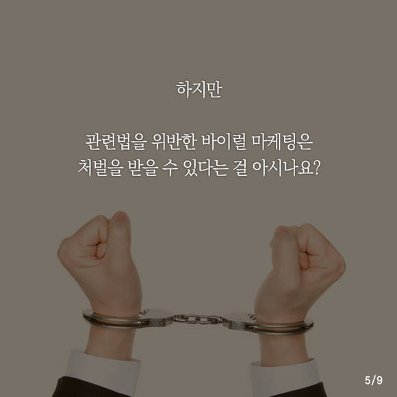 하지만 관련법을 위반해서까지 바이럴 마케팅을 펼친다면, 상당한 수위의 처벌을 받을 수 있으니 주의해야 합니다. 표시광고법을 위반한 '기만적인 광고'는 소비자의 구매선택에 엄청난 영향을 미칠 수 있는데요. 여기에 업체로부터 대가를 지급받았음을 알리지 않으면 처벌 대상이 됩니다.