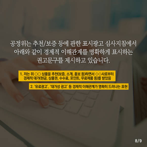 한국인터넷진흥원 자료에 따르면 공정거래법상 추천 및 보증 등에 관한 표시광고 심사지침에서 각종 경제적 이해관계를 명확하게 표시하는 권고 문구를 제시하고 있는데요.