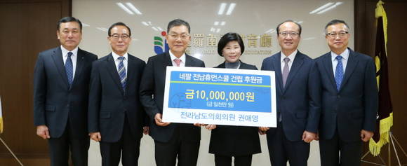 [프라임경제] 권애영 전남도의원은 5일 전라남도교육청(교육감 장만채)에 '네팔 전남휴먼스쿨 건립기금' 1000만원을 전달했다.