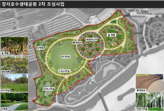 5일 시에 따르면, 장자호수생태공원은 인근 수도권 주민들까지 발길이 이어지는 명소로 자리매김하고 있는 가운데 하류 구간 2만4375㎡ 면적에 숲 체험시설과 시민들의 휴게시설인 원형파고라, 장식가변을 추가로 설치하고 주변에 잔디, 소나무 외 다양한 종의 수목, 꽃 등을 새 단장하는 2차 확장공사를 추진키로 했다는 것이다.
