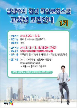 참가자격은 접수일 현재 남양주시에 주소를 둔 만 18세부터 34세 이하의 청년 구직자로 수강료는 전액 무료다.