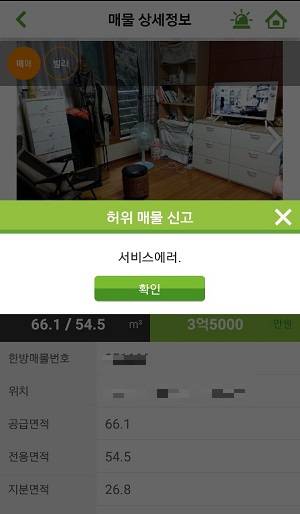 또한 앱에서 허위매물과 관련 공인중개사를 신고 절차를 밟더라도 '에러'라는 메시지만 반복돼 신고 자체가 불가능한 상황이다.