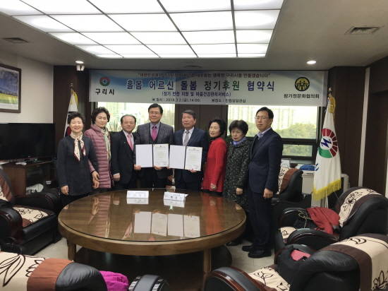 [프라임경제] 경기 구리시(시장 백경현)와 참가정문화협의회는 2일 구리시청 민원상담실에서 저소득층 홀몸 어르신 건강관리를 위한 정기적인 돌봄 후원 서비스 제공의 활성화를 위해 업무 협약을 체결했다.