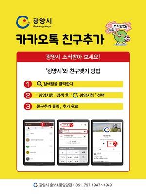 이어 김영관 홍보소통담당관은 "설치부터 민원신고까지 여러 단계를 거쳐야 하는 다른 모바일 소통채널과는 달리 카카오톡에서는 '광양시청'을 검색해 친구추가만하면 곧바로 광양시와 대화를 나눌 수 있다"며 "친절하고 빠른 SNS 소통행정으로 시민들에게 더 가까이 다가가겠다"고 말했다.