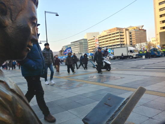 제 친구는 이 인파에 휘둘려 어떤 사람에게 맞기도 했는데요. 지친 저와 제 친구들은 세종문화회관 벤치에 앉아 숨을 돌리며 태극기을 든 이들을 바라봤습니다.