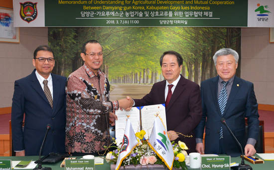 [프라임경제] 담양군은 7일 오전 11시 담양군청 대회의실에서 인도네시아 아체(Aceh)주 가요 루에스(Gayo Lues)군과 농업발전을 위한 상호협력 협약식을 개최했다고 밝혔다.
