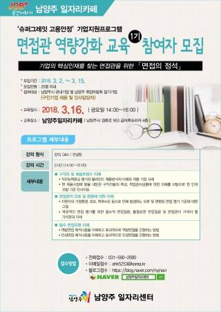 참가자격은 관내 중소기업 및 시 취업박람회 참여기업 채용담당자로서 교육비는 무료다. 자세한 사항은 시 홈페이지 또는 일자리센터 홈페이지에서 확인이 가능하며 접수는 남양주시 일자리정책과로 신청하면 된다.
