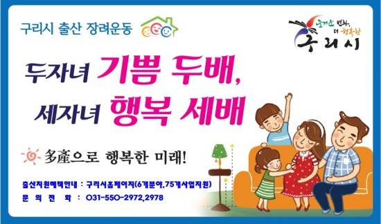 앞서 시는 2016년부터 출산율을 높이기 위해 출산지원금을 둘째아 20만원→30만원, 세째아 50만원→60만원, 넷째아 이상 100만원으로 상향, 조정한 바 있다. 구리시에 세자녀 이상 다자녀가구는 1월말 기준 1249 가구에 3840명이다.