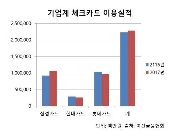 이 같은 성적 개선에는 삼성카드가 큰 몫을 해냈다. 지난해 삼성카드의 체크카드 이용실적은 1조561억원으로 2016년보다 14.8% 늘었다. 그러나 현대·롯데카드의 체크카드 이용실적은 각각 2580억원, 9668억원으로 전년보다 9%, 6% 내려가며 부진한 상황이다.