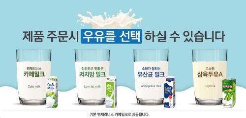 이에 따라 소비자는 기존 엔제리너스 카페밀크와 신선하고 맛좋은 '저지방 밀크', 소화가 잘되는 '유산균 밀크', 고소한 '삼육두유' 중 1종을 선택해 추가비용 없이 주문할 수 있다.