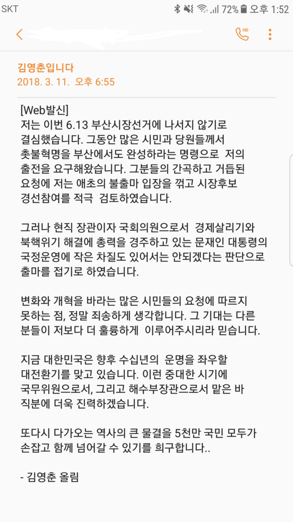 다음은 김영춘 해수부장관의 문자 메서지 전문이다.