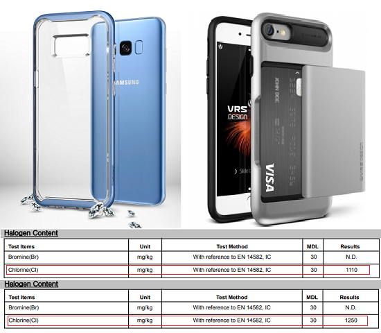 휴대폰 케이스의 최대 염소 함유량은 900㎎/㎏(할로겐프리 기준)인데, 슈피겐코리아와 베루스 제품에서는 각각 1110㎎, 1250㎎이 검출됐다. 이는 최대한도를 뜻하는 기준치의 123.3%, 138.8%에 달하는 수치다.