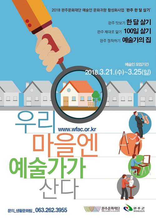 [프라임경제] (재)완주문화재단(이사장 박성일)은 오는 21일부터 25일까지 '예술인 문화귀향 활성화사업'의 일환으로 추진하고 있는 '예술인 완주 한달 살기' 프로그램에 참여할 대한민국의 예술인을 공개 모집한다고 15일 밝혔다.