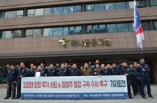 노조는 김 회장의 친동생 채용 해명도 반론했다. 노조는 "두레시닝은 하나은행의 각종 인쇄물, 판촉물, 물류배송등을 담당하는 KEB하나은행 행우회 투자회사로 은행임원들이 퇴직 후 주로 두레시닝 임원이 된다"며 "주주현황도 하나은행 행우회가 95.1%, 하나금융투자가 4.9%로 구성됐다"고 설명했다.
