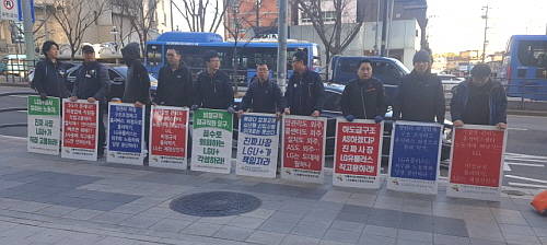 이들은 각각 '망관리 하청업체 구조 조정하고 홈서비스 하청으로 돌려막기, LG유플러스는 외주화 노동착취 당장 중단하라' '망관리도 외주, 콜센터도 외주, 설치도 외주, AS도 외주…LG는 도대체 뭘 하나' 등 문구가 적힌 팻말을 들고 농성했다.