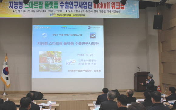 [프라임경제] 한국농어촌공사(사장 최규성)는 20일 경기 안산 농어촌연구원에서 농림축산식품부, 공사 관계자 등 전문가 50명이 참석한 가운데 '지능형 스마트팜 플랫폼 수출연구사업단 Kick off 워크숍'을 개최했다.