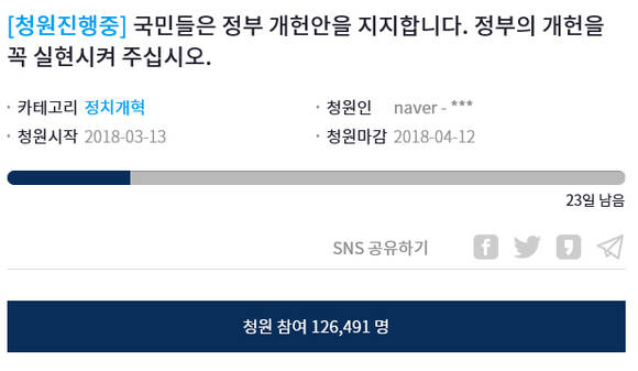 한편 지난 13일 시작된 정부 개헌안을 지지한다는 내용의 청와대 국민청원에는 20일 오후 현재 12만6000명이 넘는 찬성의견이 모여 눈길을 끌고 있다. 지방선거를 석 달 앞둔 상황에서 야당에 또 다른 압박 요인이 될 수 있는 대목이다.