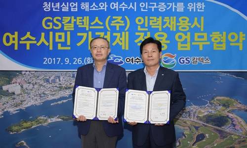 주철현 여수시장과 김병열 GS칼텍스 사장은 지난해 9월26일 인력채용 시 여수시민에게 가점제를 적용하는 내용의 협약을 체결했다.
