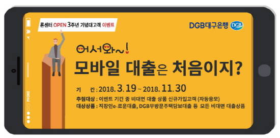 [프라임경제] DGB대구은행은 론센터 오픈 3주년을 기념해 오는 11월30일까지 DGB대구은행 비대면 대출상품 가입 고객을 대상으로 '어서와~! 모바일 대출은 처음이지?' 경품 추첨 이벤트를 실시한다고 22일 밝혔다.