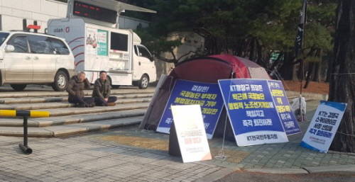 KT는 23일 오전 9시 서울 서초구 태봉로 KT연구개발센터 2층 강당에서 제 36기 정기 주총을 열었다. 주총장 밖에서부터 KT전국민주동지회 등은 황 회장 퇴진를 요구하는 팻말을 진열해놓고 농성했다.