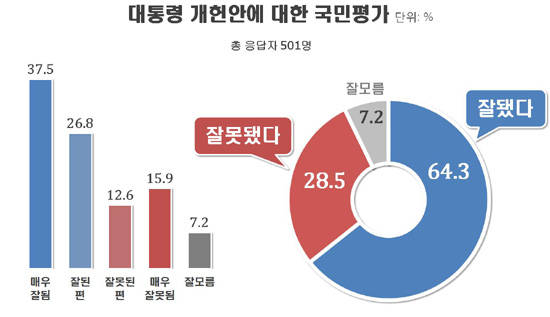 여론조사 전문기관 리얼미터가 CBS 의뢰로 △헌법전문 △기본권과 국민주권 △지방분권 △경제 △수도 조항 △선거연령 △정부형태 등을 포함한 대통령 개헌안에 대해 국민여론을 조사한 결과, '잘됐다'는 긍정평가가 64.3%로, '잘못됐다'는 부정평가 28.5%의 2배를 넘는 것으로 나타났다.