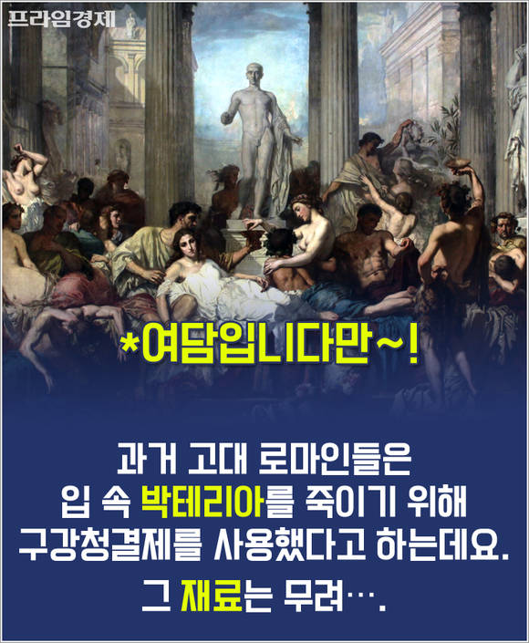 종류에 따라 충치·치주질환 예방, 구취 제거 기능은 물론이고 항균에 살균 효과까지 있는 구강청결제. 과거 고대 로마인들은 입 속 박테리아를 죽이고자 구강청결제를 사용했다는데요. 그 재료는 무려 포르투갈 사람의 소변이었다고 합니다. 아주 훗날인 19세기 들어 알코올로 대체될 때까지 쓰였다고 하네요.