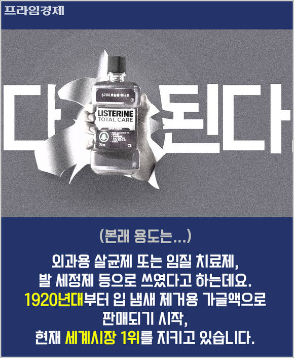 본래 용도는 외과용 살균제 또는 임질 치료제, 발 세정제 등으로 쓰였다고 하는데요. 1920년대부터 입 냄새 제거용 가글액으로 판매되기 시작했고 지금까지 세계시장 1위를 지키고 있습니다.