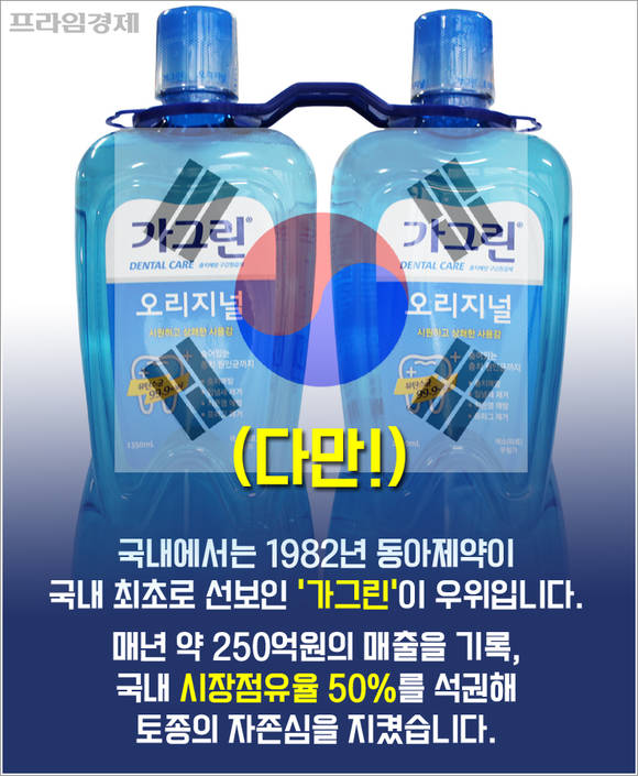 다만 우리나라에서는 1982년 동아제약에서 국내 최초로 선보인 '가그린'이 우위를 점하고 있는데요. 업계에 따르면 해마다 약 250억원의 매출을 기록, 국내 시장점유율 50%를 석권해 토종의 자존심을 지켰습니다.