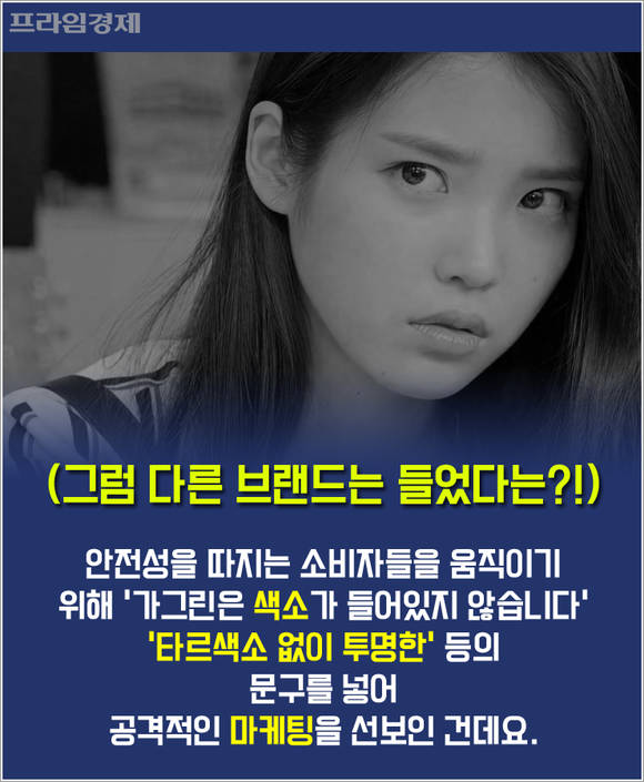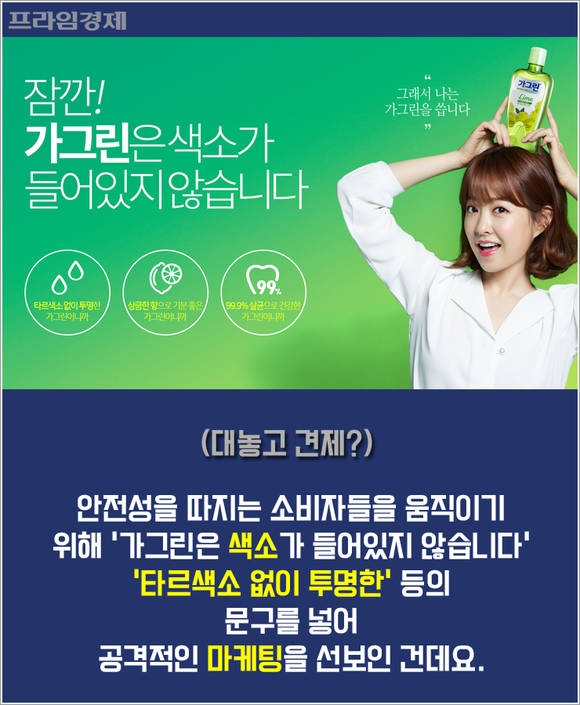 안전성을 따지는 소비자들의 마음을 움직이기 위해 '가그린은 색소가 들어있지 않습니다' '타르색소 무첨가로 투명합니다'라는 문구를 넣어 공격적인 마케팅을 선보인 건데요.