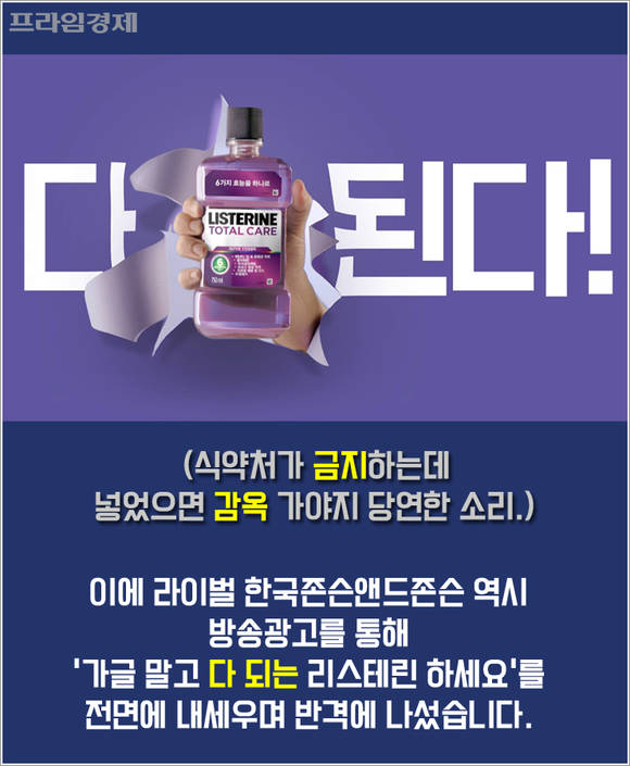 문제는 마치 경쟁사 제품에 타르색소가 들어간 것처럼 오해할 소지가 생겨버렸다는 겁니다. 이에 라이벌 한국존슨앤드존슨 역시 방송광고를 통해 '가글 말고 다 되는 리스테린하세요'를 전면에 내세우며 반격했는데요.