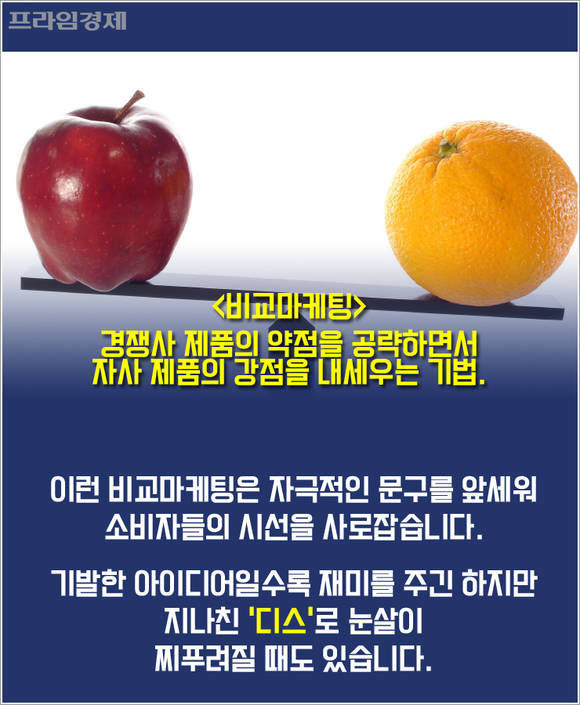 이런 비교마케팅은 자극적인 문구를 앞세워 소비자들의 시선을 사로잡습니다. 기발한 아이디어일수록 재미를 주긴 하지만 지나친 '디스'로 눈살이 찌푸려진다는 목소리도 나옵니다.