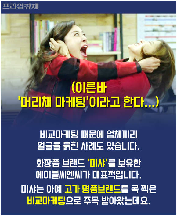 비교마케팅을 하다가 업체끼리 얼굴을 붉힌 사례도 있습니다. 화장품 브랜드 '미샤'를 보유한 에이블씨엔씨가 대표적인데요. 미샤는 아예 고가의 명품브랜드를 콕 찍어 비교마케팅을 펼쳐 상당한 주목을 받은 바 있습니다.