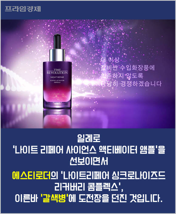 일례로 '나이트 리페어 사이언스 액티베이터 앰플'을 출시하면서 에스티로더의 '나이트리페어 싱크로나이즈드 리커버리 콤플렉스', 일명 '갈색병'에 도전장을 던진 것인데요.