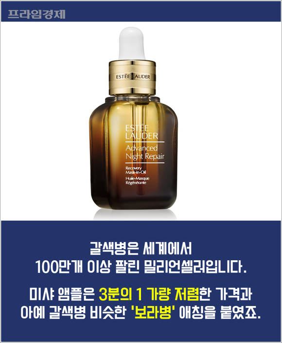 갈색병은 비싼 값임에도 세계에서 100만개 이상 팔린 밀리언셀러입니다. 이에 비해 미샤 앰플은 3분의 1 수준으로 저렴하면서 에스티로더의 갈색병을 연상할 수 있도록 '보라병'이라는 애칭을 붙였죠. '이제 더 이상 값비싼 수입화장품에 의존하지 않아도 됩니다'라는 카피는 결정타가 됐습니다.