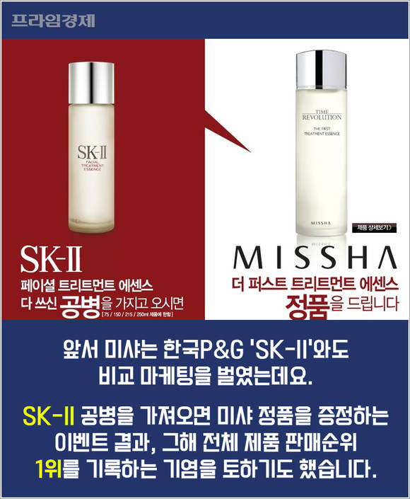 앞서 미샤는 한국P&G가 판매하는 'SK-II'와도 비교 마케팅을 벌였는데요. SK-II 에센스 공병을 가져오면 미샤 에센스 정품을 증정하는 이벤트를 진행했습니다. 이후 미샤 제품은 출시 3주 만에 3만개 이상이 판매되면서 그해 전체 제품 중 판매순위 1위를 기록했죠.