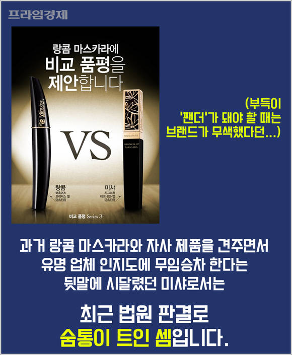 명품과의 비교마케팅으로 재미를 본 미샤는 해당 판결 이후 더욱 가열찬 마케팅 행보를 고수하는 모양새인데요. 최근에는 랑콤 마스카라와 자사 제품을 견주면서 유명 업체의 인지도에 무임승차한다는 뒷말에 시달리고 있습니다.
