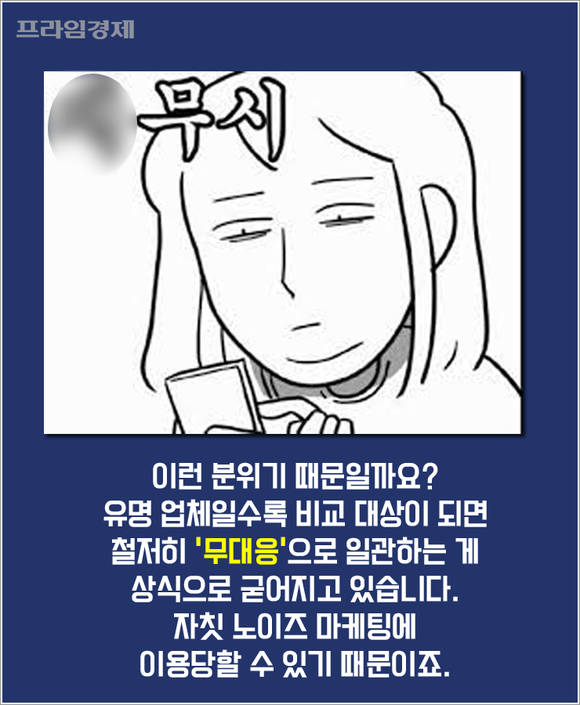 이런 분위기 때문일까요? 비교의 대상이 되는 유명업체일수록 철저히 '무대응'으로 일관하는 경우가 보통이 되는 모양입니다. 자칫 노이즈 마케팅에 이용당할 수 있기 때문이죠.