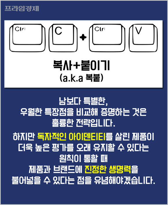 남보다 특별한, 우월한 특장점을 비교해 증명하는 것은 훌륭한 전략입니다. 하지만 자신만의 아이덴티티를 살린 제품이 더욱 높은 평가를 오래 유지할 수 있다는 원칙이 통할 때 제품과 브랜드에 진정한 생명력을 불어넣을 수 있다는 점을 유념해야겠습니다.
