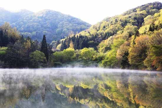 어둠이 걷히면서 소리 없이 물안개가 피어오르면 호수를 에워싼 산자락에는 이들이 서로 조화를 이루는 모습은 숨이 멎을 정도로 환상적이다.
