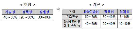 과기정통부는 우선 평가항목 비율을 조정해 전문성을 강화한다는 방침이다. 기존에 30∼40%였던 경제성은 5∼10%, 응용개발은 10∼40%로 축소하고, 과학기술성도 기초연구는 50∼60%, 응용개발은 40∼60%로 조정했다.