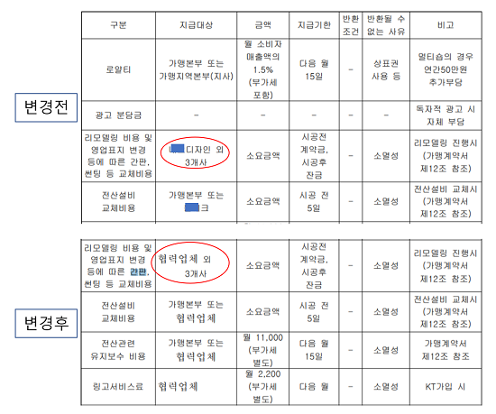 또 간판교체 시 발생하는 비용의 지급대상은 가맹본부가 아닌 'ㄴ디자인'을 비롯한 4개 업체로 한정하고, 예상금액을 구체적 액수가 아닌 '소요금액'으로 표시한 것 역시 문제가 있다는 지적이다.