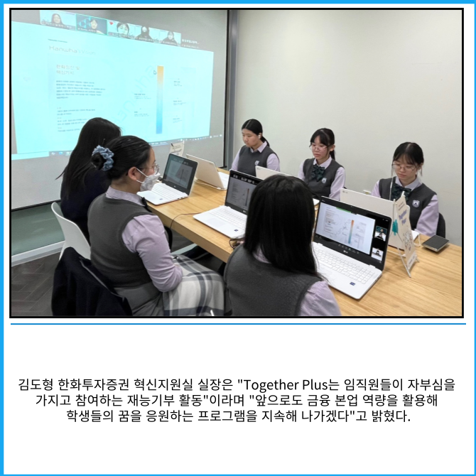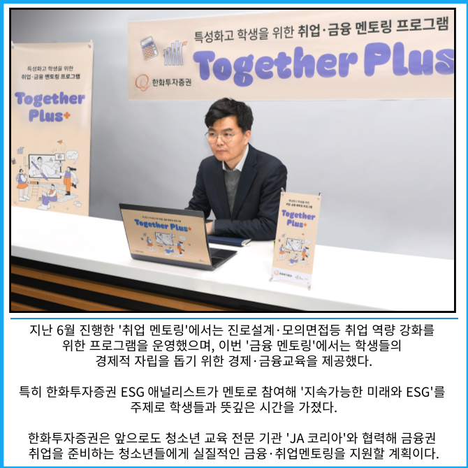 'Together Plus'는 한화투자증권 임직원이 멘토가 되어 금융권 취업을 희망하는 특성화고 학생들에게 금융·취업 멘토링을 제공하는 사회공헌 활동이다.